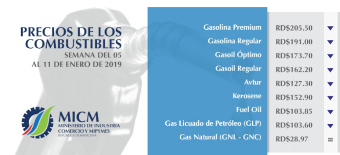 SANTO DOMINGO, RD.- El Ministerio de Industria, Comercio y Mipymes dispuso bajas nuevamente en los precios de casi todos los combustibles para la semana del 5 al 11 de enero de 2019.